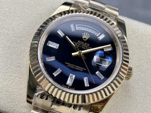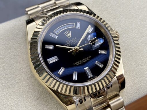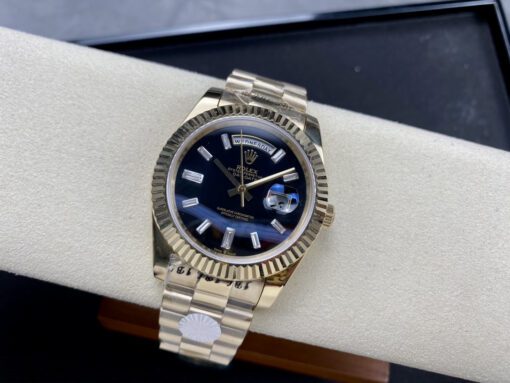 Rolex Day-Date Serie. 40-mm-Durchmesser. Ausgestattet mit importiertem japanischen 8215 mechanischem Uhrwerk. RingCommand dreieckig geriffelte Lünette. Kratzfestes Saphirglas. Gehäuse aus 316L-Edelstahl. Oystersteel-Armband mit Drei- oder Fünfglied-Optionen. Originale Schließe.