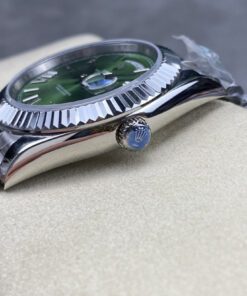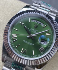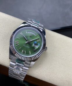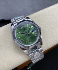 Rolex Day-Date Serie. 40-mm-Durchmesser. Ausgestattet mit japan-importiertem 8215 mechanischem Werk. RingCommand dreieckige geriffelte Lünette. Kratzfestes Saphirglas. Gehäuse aus 316L Edelstahl. Oystersteel-Armband mit Drei- oder Fünf-Glieder-Optionen. Originale Schließe.