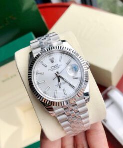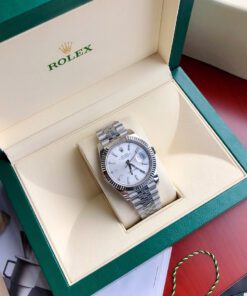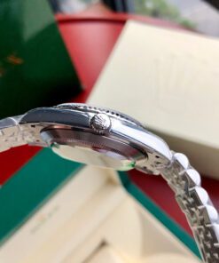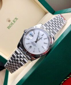 Rolex Datejust Uhr mit einem 41mm Edelstahlgehäuse, Saphirglas und Zyklopenlinse über dem Datum. Angetrieben von einem automatischen Uhrwerk, bietet sie 100m Wasserdichtigkeit und ein Edelstahlarmband, das zeitlose Eleganz und Funktionalität verkörpert.