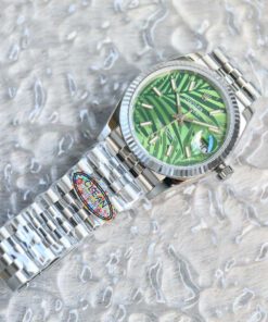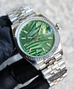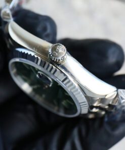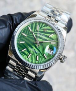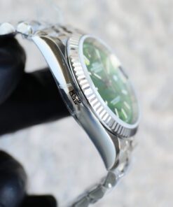 Rolex Datejust 36mm. Angetrieben von einem Automatikwerk mit einstellbarem Kalender. 904L Edelstahlgehäuse mit AR Factory Stahlarmband und platinierter Lünette. Sonnenstrahlen-Zifferblatt mit minzgrüner Option. Schweizer C1+C3 Leuchtmasse für passende Stundenmarkierungen und Zeiger. Weißgold-beschichtete Kronenmarkierungen. Drei-Code-Übereinstimmung.