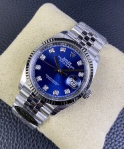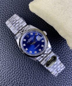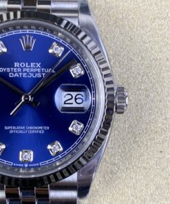 Rolex Datejust 126234. Gehäusedurchmesser 36-mm in 904L Edelstahl mit geriffelter Lünette. Verfügt über diamantbesetzte Stundenmarkierungen und mehrere Zifferblattfarben, darunter Blau, Schwarz, Grün und weiße römische Ziffern. Angetrieben durch Kaliber 3235 Automatikwerk.