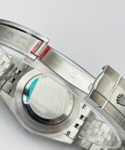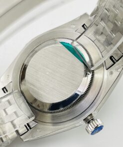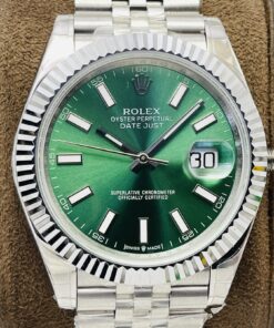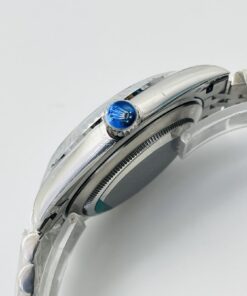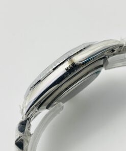 Rolex Datejust. 41-mm-Edelstahlgehäuse mit polierter und gebürsteter Oberfläche. Ausgestattet mit Cal.2836 Automatikwerk für präzise und stabile Zeitmessung. Zifferblatt mit handgesetzten Swarovski-Diamanten. Saphirglas mit Antireflexbeschichtung und Zyklopen-Datumsvergrößerung. 904L Edelstahl Oysterarmband mit Faltschließe. Gehäuseseite mit QR-Code für Authentizität.