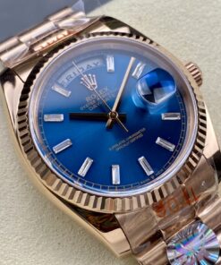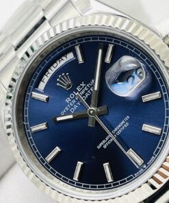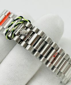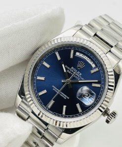 Rolex Day-Date, eine elegante 40-mm-Uhr mit einem Gehäuse aus 316L Edelstahl und einem Saphirglas mit Zyklopenlinse. Verfügt über eine Anzeige für Tag und Datum, super-leuchtende Zeiger und ein 2836 Automatikwerk. Ausgestattet mit einem Armband im Präsidenten-Stil mit Faltschließe.