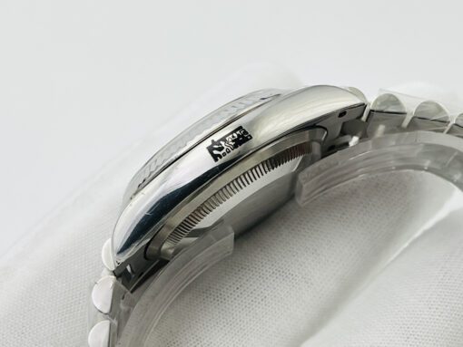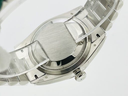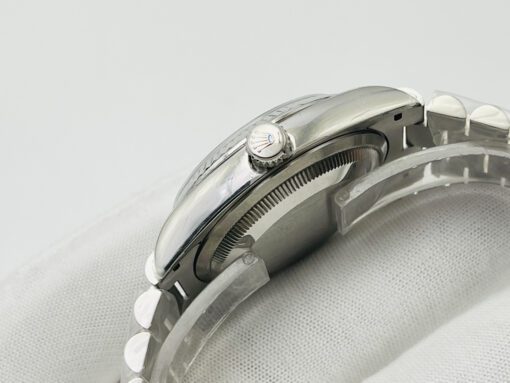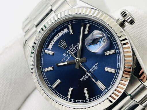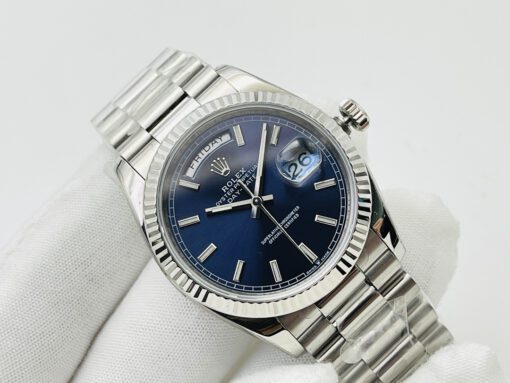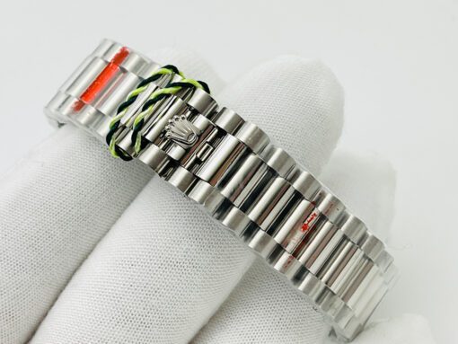 Rolex Day-Date, eine elegante 40-mm-Uhr mit einem Gehäuse aus 316L Edelstahl und einem Saphirglas mit Zyklopenlinse. Verfügt über eine Anzeige für Tag und Datum, super-leuchtende Zeiger und ein 2836 Automatikwerk. Ausgestattet mit einem Armband im Präsidenten-Stil mit Faltschließe.