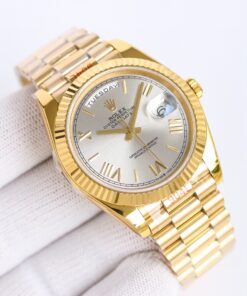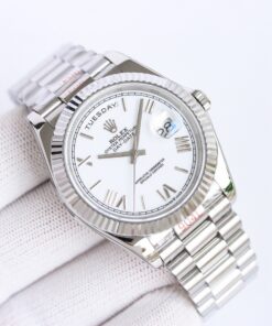 Rolex Day-Date 40, 40mm Durchmesser, 2836 automatisches Uhrwerk, Saphirglas mit 2,5-fach Datumsvergrößerung, Oyster-Gehäuse, sofortiger Tag- und Datumswechsel, 904L Edelstahl, präzise Handwerkskunst.