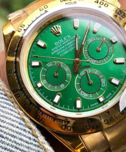 Rolex Daytona, ein auffälliger 43mm Chronograph mit einem 316L Edelstahlgehäuse und Saphirglas. Verfügt über eine grüne Keramiklünette mit eingravierter Tachymeterskala und ein Edelstahlarmband mit originaler Schließe. Angetrieben von einem Automatikwerk.