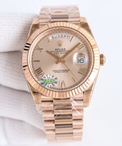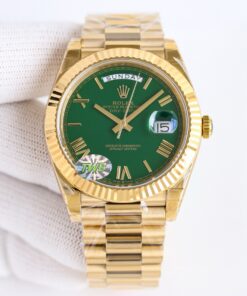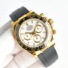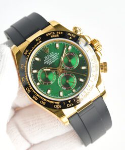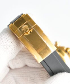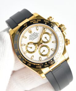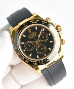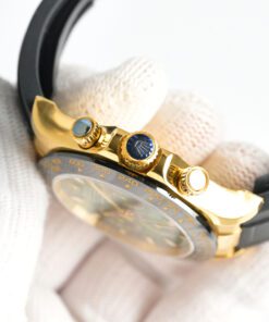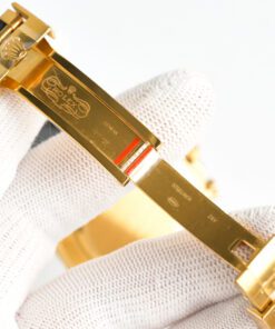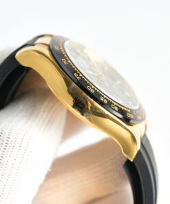 Rolex Daytona 18K Gold. GTC-zertifiziert, online überprüfbar. Original geformtes 40mm Gehäuse, Keramiklünette mit Tachymeter, kratzfest, nicht verblassend. Gestapeltes Druckverfahren für erhabenes Zifferblatt-Logo, passend zur originalen Textur. Koma leuchtend für Lesbarkeit, flaches Saphirglas, fälschungssichere Krone bei 6 Uhr. Polierte Edelstahlschließe mit eingraviertem Logo und Sicherheitsring.