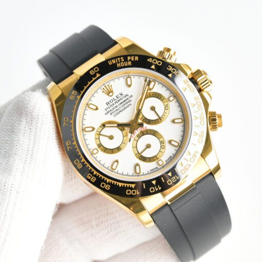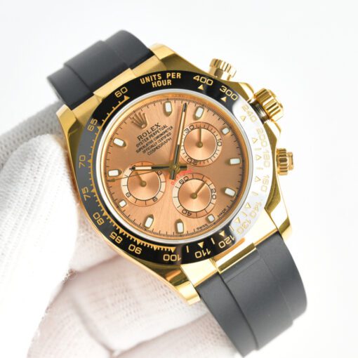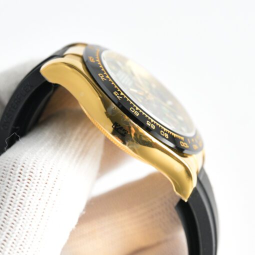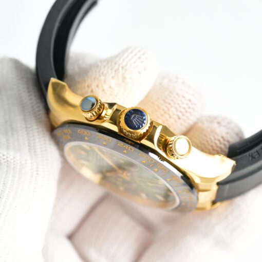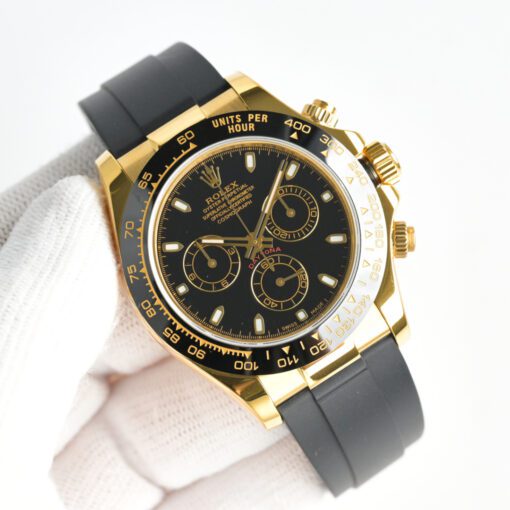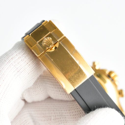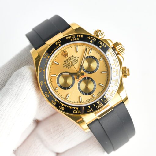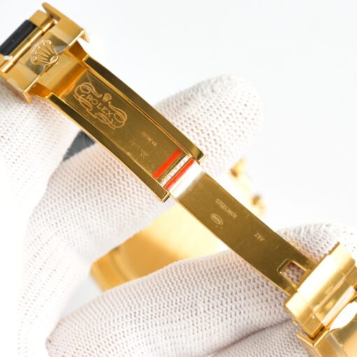 Rolex Daytona 18K Gold. GTC-zertifiziert, online überprüfbar. Original geformtes 40mm Gehäuse, Keramiklünette mit Tachymeter, kratzfest, nicht verblassend. Gestapeltes Druckverfahren für erhabenes Zifferblatt-Logo, passend zur originalen Textur. Koma leuchtend für Lesbarkeit, flaches Saphirglas, fälschungssichere Krone bei 6 Uhr. Polierte Edelstahlschließe mit eingraviertem Logo und Sicherheitsring.