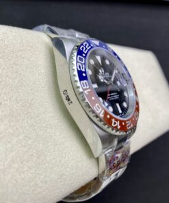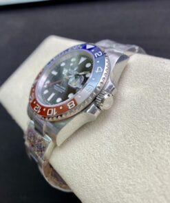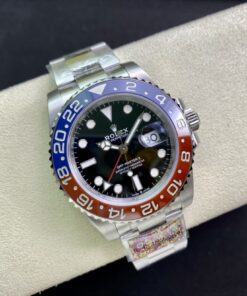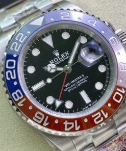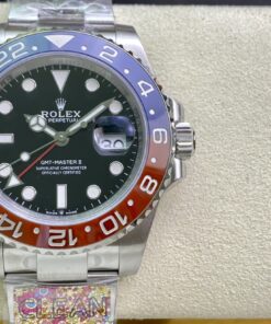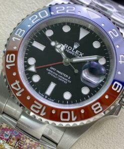 Rolex GMT-Master II, mit einer rot-blauen Keramiklünette, 904L Edelstahlgehäuse und einem 3186 Automatikwerk für Zwei-Zeitzonen-Funktionalität.