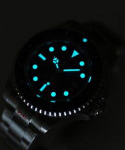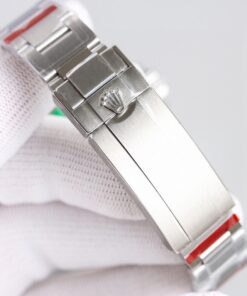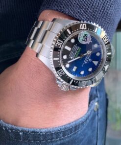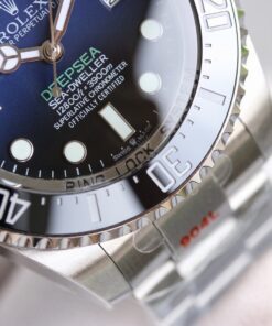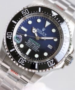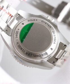 Rolex Sea-Dweller mit einem 44mm Edelstahlgehäuse und Saphirglas. Verfügt über ein 2836 Werk, Keramiklünette mit gravierten Markierungen und blassblaue Leuchtmasse für Tiefsee-Haltbarkeit.