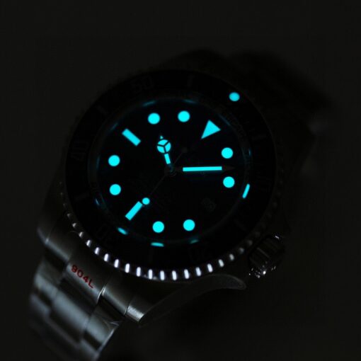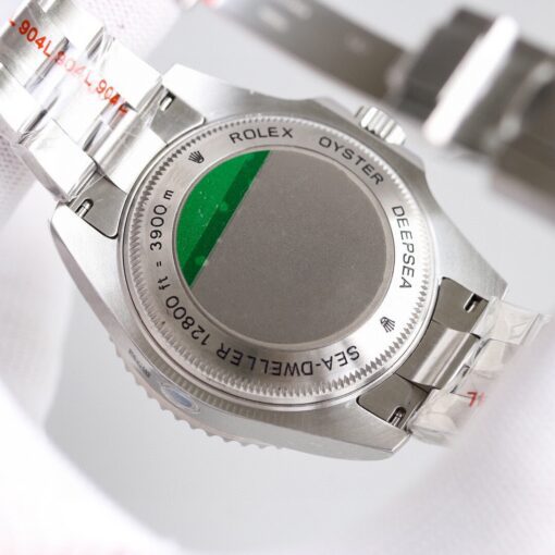 Rolex Sea-Dweller mit einem 44mm Edelstahlgehäuse und Saphirglas. Verfügt über ein 2836 Werk, Keramiklünette mit gravierten Markierungen und blassblaue Leuchtmasse für Tiefsee-Haltbarkeit.