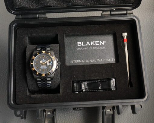 Blaken Rolex Submariner: Verfügt über ein DLC-schwarz beschichtetes Gehäuse für ein elegantes, langlebiges Finish. Dunkel-schwarzes Zifferblatt mit sandgestrahlter Textur für eine einzigartige Ästhetik. Integriertes 3135 Uhrwerk sorgt für präzise und stabile Zeitmessung. 40 mm Gehäuse mit 11 mm Dicke für ergonomischen Komfort.