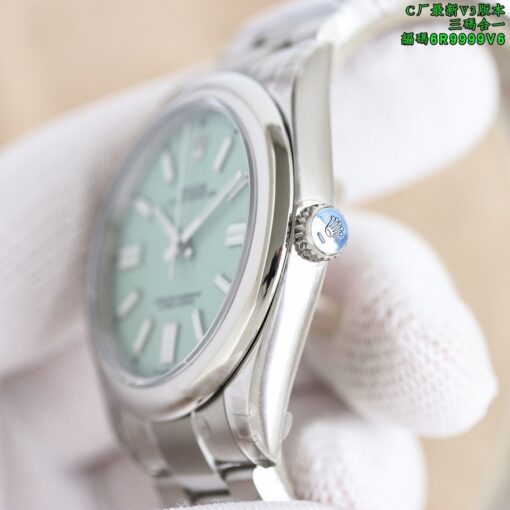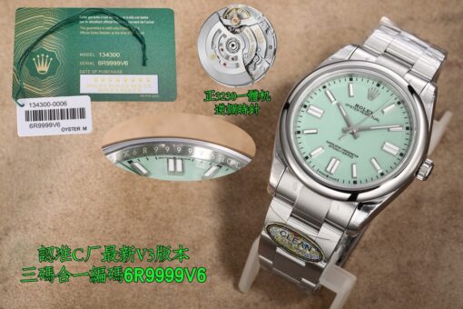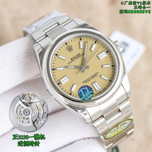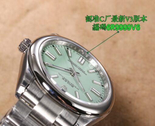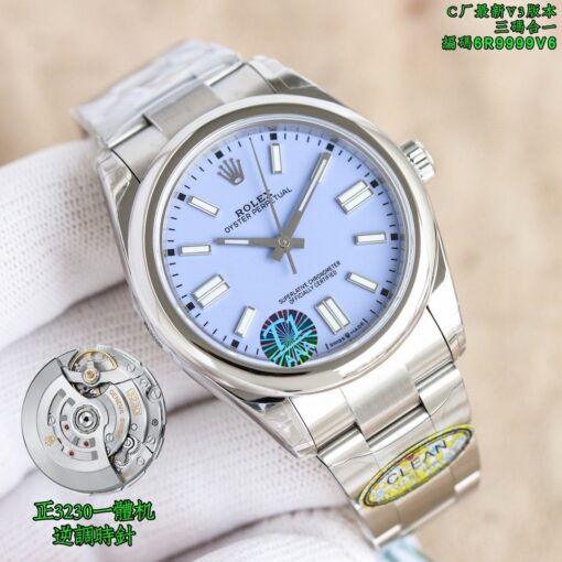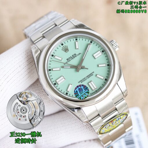 Clean Factory Oyster Perpetual 126000 mit gelben, blauen oder lila Zifferblattoptionen. Angetrieben von einem 3230 integrierten Werk ohne Kalender-Leerlaufposition. Zifferblattfarben entsprechen dem Original ohne Farbunterschied. Verfügt über polierte abgeschrägte Markierungen und fortschrittliche Drucktechnologie für scharfen Text. Superleuchtende Zeiger ohne Grate. Neun originale Zifferblattfarben verfügbar. 36mm bis 41mm Gehäusegrößen mit 904L Stahlkonstruktion. Inklusive NFC-Karte für Authentizität.