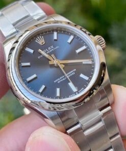 Rolex Oyster Perpetual mit minimalistischem Design. Verfügt über ein 31mm Edelstahlgehäuse, Automatikwerk, Saphirglas und Edelstahlarmband.