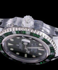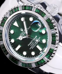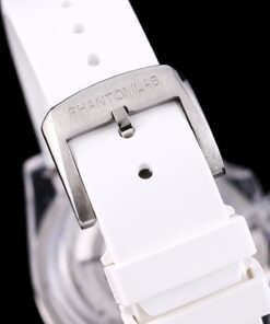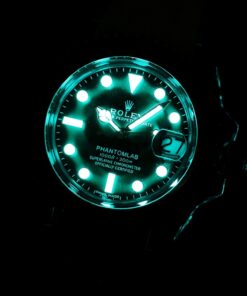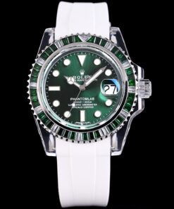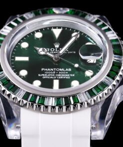 Rolex Phantomlab modifizierte Uhr mit einem 40mm importierten Kristallgehäuse, das moderne Ästhetik und Handwerkskunst kombiniert. Verfügt über ein transparentes Fluororubber-Armband und ein zusätzliches TPE-Armband. Ausgestattet mit Schweizer ETA 2824 Automatikwerk, blauen Leuchtmarkierungen, Zeigern und Lünette sowie einem Saphirglas mit blaugefärbter Vergrößerungslinse. Bricht mit dem traditionellen geschlossenen Rolex-Gehäuseboden-Design.