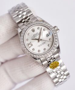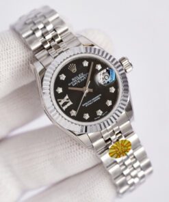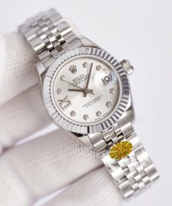 Rolex Datejust Damenarmbanduhr mit klassischem Design. Mit 28mm Edelstahlgehäuse, Automatikwerk, Saphirglas und Edelstahlarmband.