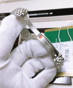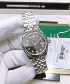 Rolex Lady-Datejust, eine raffinierte 28mm-Uhr mit einem Gehäuse aus 904L-Edelstahl und Saphirglas mit Cyclops-Linse für Datumsvergrößerung. Verfügt über ein langlebiges Automatikwerk und die Wahl zwischen Oyster- oder Jubilé-Armband mit verdeckter Faltschließe.