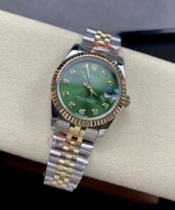Rolex Lady-Datejust, eine elegante 31mm-Uhr mit einem Gehäuse aus 316L-Edelstahl und Saphirglas mit Cyclops-Linse. Verfügt über eine mit Diamanten besetzte Lünette und ein zuverlässiges Automatikwerk. Erhältlich mit Oyster- oder Jubilé-Armband.