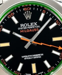 Rolex Milgauss-Serie. Ein 40mm Oysterstahl-Gehäuse mit grünem Saphirglas und elektro-optischem Blau- oder Grünzifferblatt. Verfügt über einen blitzförmigen Sekundenzeiger und eine antimagnetische doppelte Gehäuserückseite. Ausgestattet mit einem angepassten 3131 Uhrwerk für zuverlässige Leistung. Gefertigt aus 904L Stahl für hohe Korrosionsbeständigkeit. Entworfen, um wissenschaftliche Präzision zu ehren.