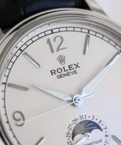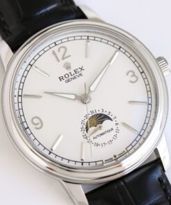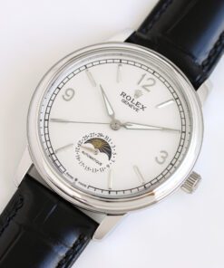 Rolex Cellini Moonphase mit einem 40mm Edelstahlgehäuse, ausgestattet mit einem ETA 2824-2 automatischen Uhrwerk mit Datums- und Mondphasenfunktionen. Das Zifferblatt ist durch ein Saphirglas geschützt, kombiniert mit einem italienischen Lederarmband.