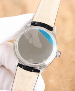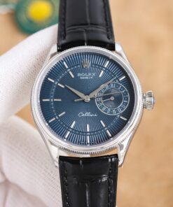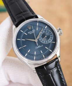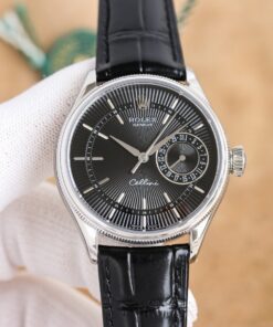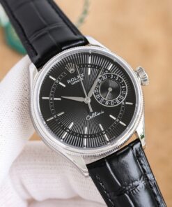 Rolex Cellini Date Herrenuhr. 39mm Gehäuse mit 11,5mm Dicke. 316L Edelstahl mit dicker Goldbeschichtung. Wellenmuster-Zifferblatt mit leuchtenden Zeigern. 3165 Uhrwerk mit Datumsfunktion. Saphirglas und amerikanisches Lederarmband mit Stiftschließe. 50m Wasserdichtigkeit.