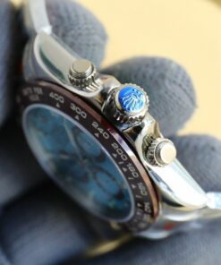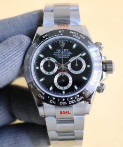 Rolex Cosmograph Daytona. 40mm 904L Edelstahlgehäuse. Angepasstes 7750 Uhrwerk passend zur 4130 Funktionalität. 12,4mm Dicke. Aufgewertete Keramiklünette mit platinbeschichteten Ziffern. Schweizer Leuchtmarkierungen. Saphirglas mit Antireflexbeschichtung. Edelstahl- oder Kautschukarmband mit Faltschließe.