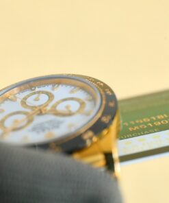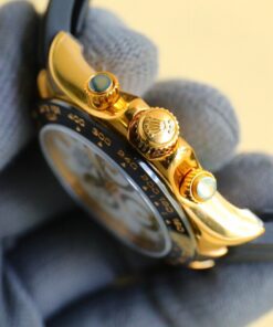 Rolex Cosmograph Daytona. 40mm 904L Edelstahlgehäuse. Angepasstes 7750 Uhrwerk passend zur 4130 Funktionalität. 12,4mm Dicke. Aufgewertete Keramiklünette mit platinbeschichteten Ziffern. Schweizer Leuchtmarkierungen. Saphirglas mit Antireflexbeschichtung. Edelstahl- oder Kautschukarmband mit Faltschließe.