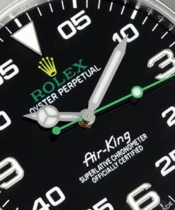 Rolex Air-King Serie. Ein 40mm Oystersteel-Gehäuse mit markantem schwarzem Zifferblatt mit großen Ziffern bei 3, 6 und 9 sowie auffälligen Minutenmarkierungen für verbesserte Lesbarkeit. Huldigt Luftfahrtpionieren mit grünem Sekundenzeiger und Logo. Ausgestattet mit einem 3230 Uhrwerk für präzise Zeitmessung. Das Oyster-Armband sorgt für Langlebigkeit und Komfort. Eine Hommage an Rolex’ Luftfahrttradition.