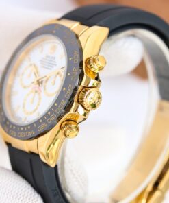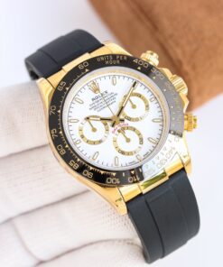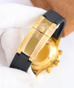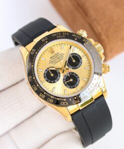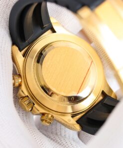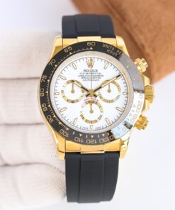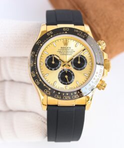 WJ Rolex Cosmograph Daytona: 40mm Gehäuse mit 904L Edelstahl und 18K Goldbeschichtung. Keramik-Rahmen mit Tachymeter. Saphirglas mit Antireflex-Beschichtung. Leuchtende Marker und Zeiger. 7750 Uhrwerk sorgt für stabile Chronographenfunktion. Oyster-Schließe mit Erweiterungssystem.