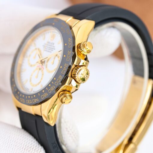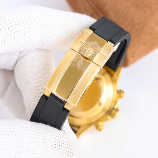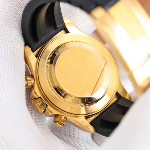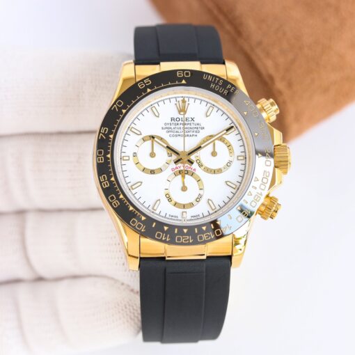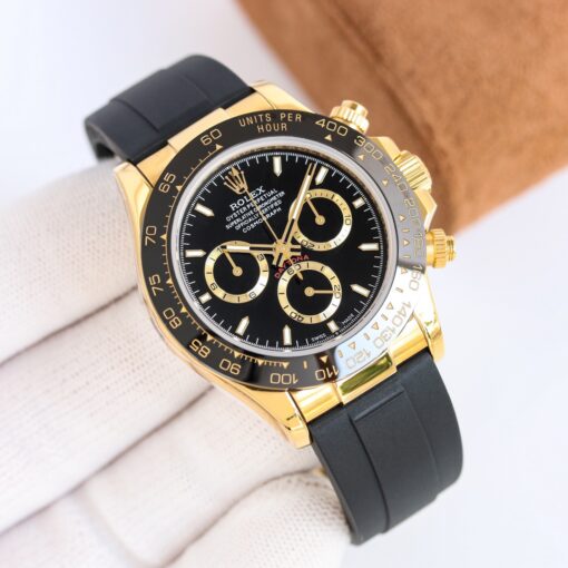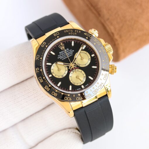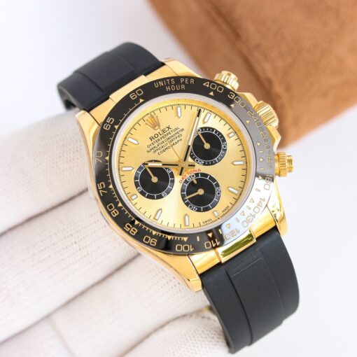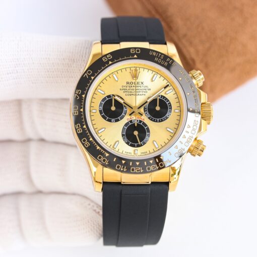 WJ Rolex Cosmograph Daytona: 40mm Gehäuse mit 904L Edelstahl und 18K Goldbeschichtung. Keramik-Rahmen mit Tachymeter. Saphirglas mit Antireflex-Beschichtung. Leuchtende Marker und Zeiger. 7750 Uhrwerk sorgt für stabile Chronographenfunktion. Oyster-Schließe mit Erweiterungssystem.